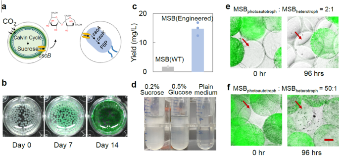 图5:MSBC平台构建光合自养菌群。a. 蓝藻和大肠杆菌组成的光合自养菌群示意图。b. 海藻酸盐水凝胶封装的蓝藻细胞可以在MSB中生长。c. 蓝藻MSB在渗透压力下产生并释放蔗糖到胞外。d. 工程化大肠杆菌可以利用蔗糖作为碳源生长。e. 蓝藻MSB低接种密度条件下,大肠杆菌MSB生长不明显。f. 蓝藻MSB高接种密度条件下,大肠杆菌MSB中形成多个菌落。