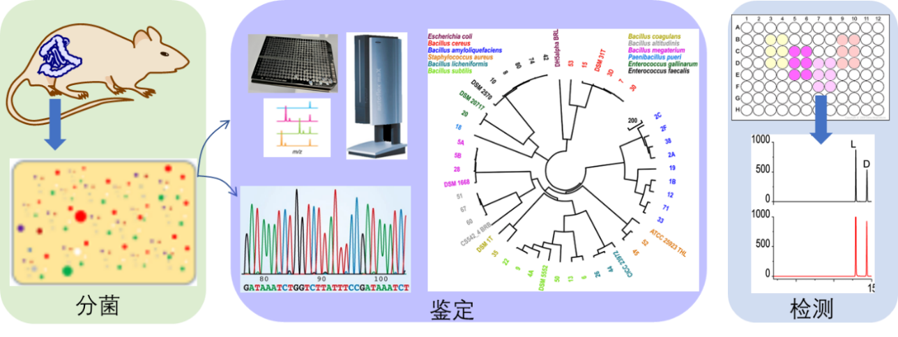 本研究第一时间建立了一个大鼠肠道菌的分离和鉴定的高通量方案,然后采用酶法快速筛选大鼠肠道菌产D型氨基酸的能力,最后经SCX-SPE富集后采用手性LC-MS/MS对这些主要生产菌株进行D型氨基酸产物谱的准确定量(图1)。