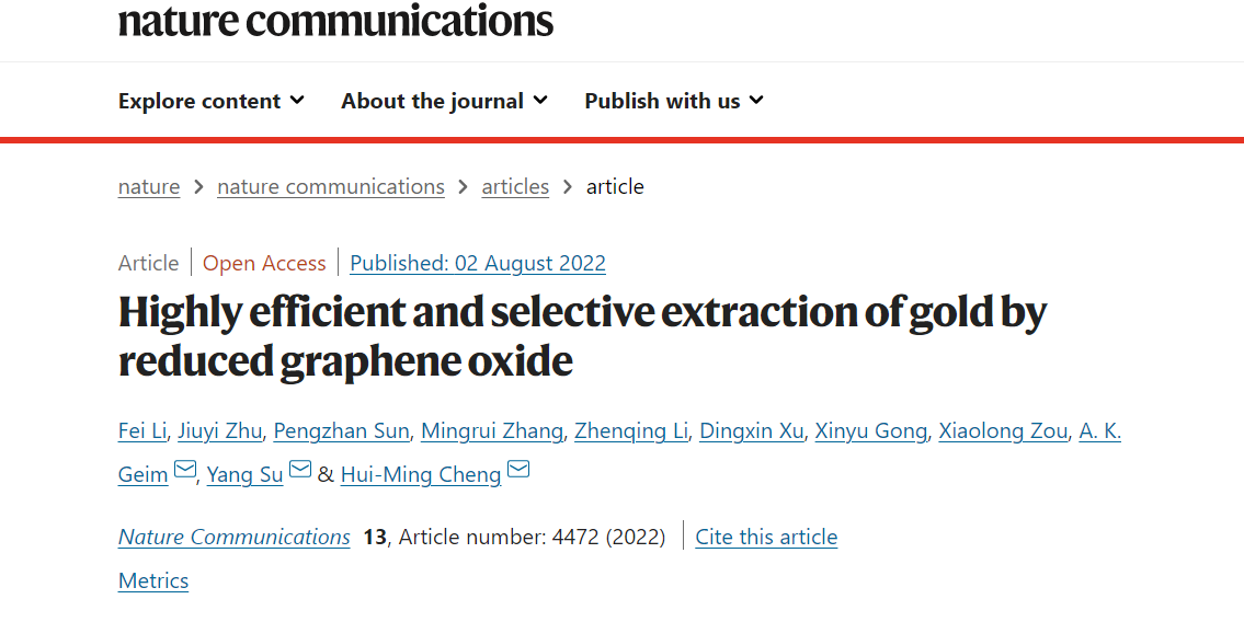 该研究工作以“还原氧化石墨烯高效、选择性提取金”(Highly Efficient and Selective Extraction of Gold by Reduced Graphene Oxide)为题发表在国际著名期刊《自然·通讯》(Nature Communications上。清华大学深圳国际研究生院2020级博士生李飞及清华大学深圳国际研究生院博士后朱九一为共同第一作者;成会明、Andre Geim及清华大学深圳国际研究生院、深圳盖姆石墨烯中心苏阳助理教授为论文通讯作者;论文作者还包括曼彻斯特大学孙鹏展博士、清华大学深圳国际研究生院副教授邹小龙、博士后李振庆等。本工作得到了清华深圳国际研究生院科研启动基金和深圳盖姆石墨烯中心的资助。
