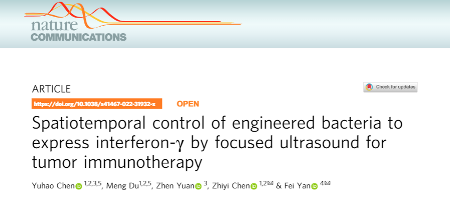 Yuhao Chen; Meng Du; Zhen Yuan; Zhiyi Chen; Fei Yan. Spatiotemporal control of engineered bacteria to express interferon-γ by focused ultrasound for tumor immunotherapy. Nature Communications, 2022, 13:4468.doi: http://doi.org/10.1038/s41467-022-31932-x.