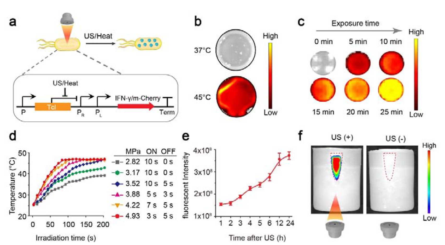 研究团队第一时间利用pR-pL启动子构建了携带mCherry荧光报告基因的温控基因表达线路,将其导入肿瘤靶向细菌MG1655中,制备取得了一种超声响应性工程菌。测试结果表明,携带mCherry基因的工程菌在37℃孵育后未产生任何荧光信号,而在45℃孵育后可以观察到强烈的红色荧光信号,表明热诱导可以解除TcI的抑制启动mCherry基因的表达。将热诱导时间从5 min延长到25 min,可见基因表达的荧光信号强度逐渐增加。接着研究团队对超声参数进行了优化,结果表明在4.93 MPa声压下,超声3 s 间隔5 s的辐照参数可以将靶区温度维持在45℃。经优化后超声参数进行辐照细菌后,可见细菌表达荧光信号强度随时间逐渐增加。鉴于超声具有高的组织穿透性,研究团队将装有细菌的EP管插入琼脂仿体,在优化超声参数下顺利获得辐照仿体中的细菌,可观察到荧光信号只出现在接受超声照射的样品位置,由此证明超声可调控深部组织样品中细菌的基因表达(图1)。