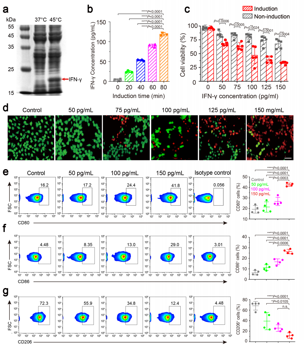 研究团队顺利获得将IFN-γ替换mCherry基因制备取得了携载IFN-γ温控基因表达线路的工程化细菌,测试了该工程化细菌在超声辐照下的IFN-γ 表达及其生物学效应,发现水浴45℃与超声辐照均能诱导工程化细菌表达IFN-γ。接着,研究团队将经超声诱导后的细菌培养基(含分泌肽的IFN-γ可分泌出细菌)与肿瘤细胞共孵育,发现可明显抑制肿瘤细胞活性。而将经超声诱导后的细菌培养基(含IFN-γ)与巨噬细胞共孵育,结果显示M1型巨噬细胞占比明显增加,表明超声诱导工程化细菌表达产生的IFN-γ具有肿瘤杀伤活性并能诱导M1型巨噬细胞极化(图2)。