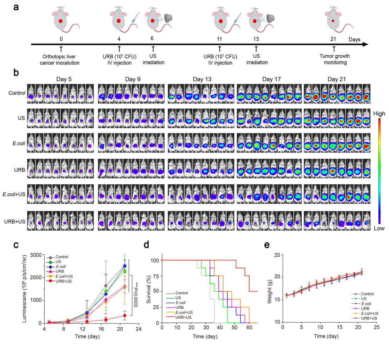 为探讨超声调控细菌表达IFN-γ能否用于深部肿瘤的治疗,研究团队建立了小鼠原位移植肝肿瘤模型。在小鼠肝脏内接种H22-Luc细胞4天后,静脉注射超声响应性细菌,两天后采用超声辐照肿瘤,借助小动物活体成像观察原位肝肿瘤的生长情况,结果显示,超声调控细菌表达IFN-γ可以有效抑制原位肝肿瘤的生长,并提高荷瘤小鼠的存活率(图5)。