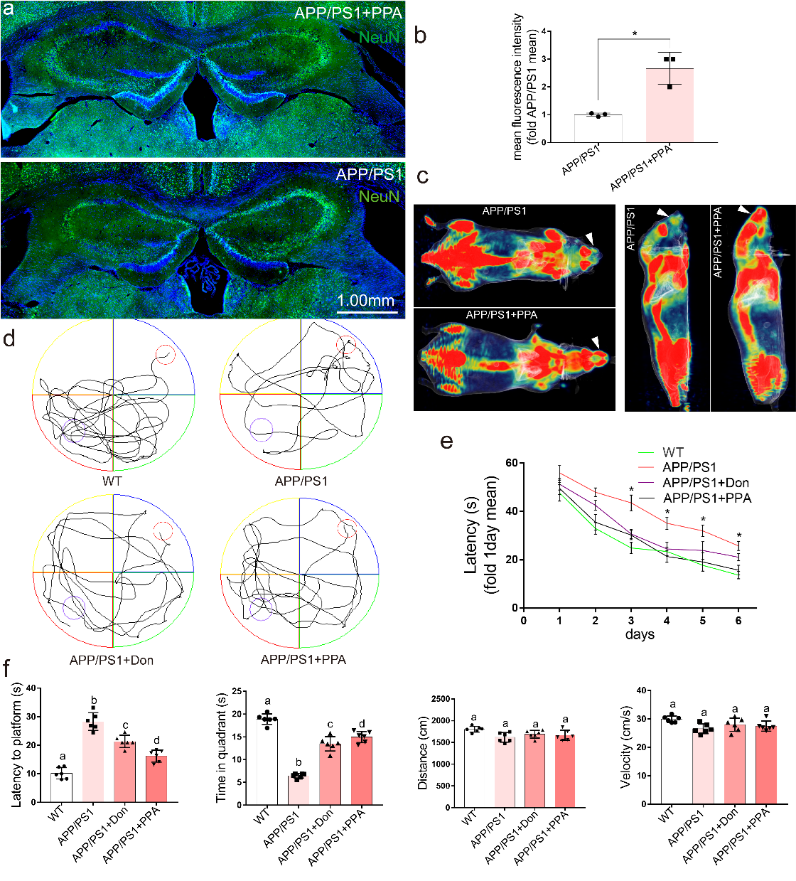 PPA经小鼠静脉注射后能够挽救AD小鼠中神经元(被NeuN标记)的病理损伤和凋亡(图5a,b)。18F-FDG-PET结果显示PPA能够增加小鼠体内FDG的脑内分布,表明PPA治疗使神经元的代谢和功能性得到了显著恢复(图5c)。进一步的行为学检测(水迷宫实验)显示PPA纳米颗粒的治疗显著增强了AD老鼠的记忆能力(图5d-f)。