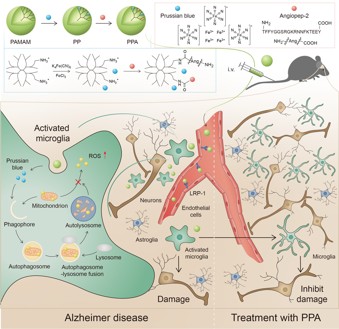 在该工作中,研究团队开发了一种拥有优异的血脑屏障(BBB)通透性的纳米颗粒,由普鲁士蓝/聚酰胺-胺型(PAMAM)树状大分子/血管生成素-2 (PPA)组成,顺利获得调节线粒体自噬,清除活性氧因子(ROS)恢复小胶质细胞的生理功能,从而治疗阿尔茨海默症。文章的第一作者为于寅课题组研究助理钟刚,共同一作为石胜良团队龙惠萍;于寅副研究员和陈飞副研究员、广西医科大学第二附属医院石胜良教授为共同通讯作者。