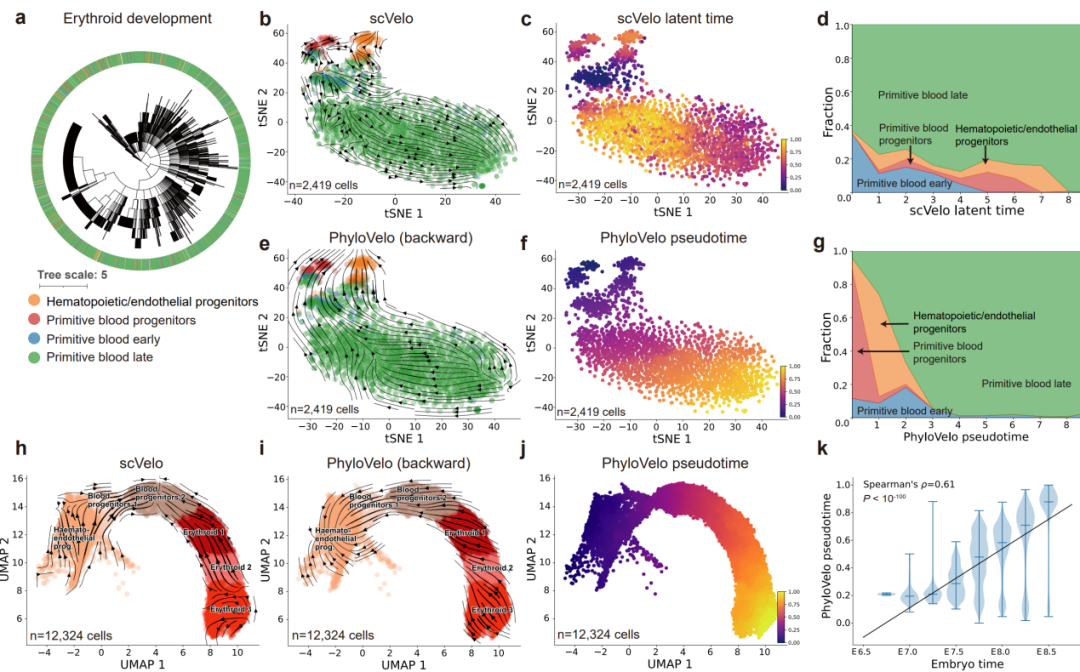 作者在多种仿真数据和真实数据上对PhyloVelo算法的准确性和鲁棒性进行了验证,PhyloVelo都能够高准确地推断仿真数据中的线性、分叉和趋同等复杂分化结构,与真实分化轨迹高度一致(图2)。此外,PhyloVelo还在小鼠早期胚胎发育中表现出优于RNA velocity的性能,能够准确地识别出红细胞系列中血液/内皮祖细胞作为最早期的细胞类型,并且与细胞增殖能力呈强相关(图3)。