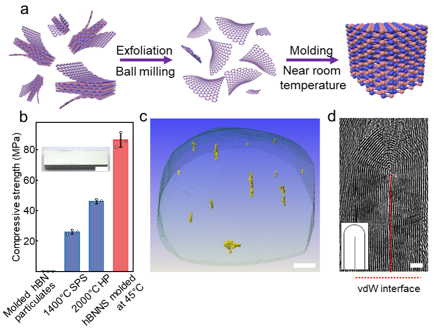 范德华块体材料,如六方氮化硼和石墨,在导热和高温结构材料等领域有重要应用。然而这类范德华块体材料通常需要在高于1000°C的高温下烧结制备、能耗巨大。