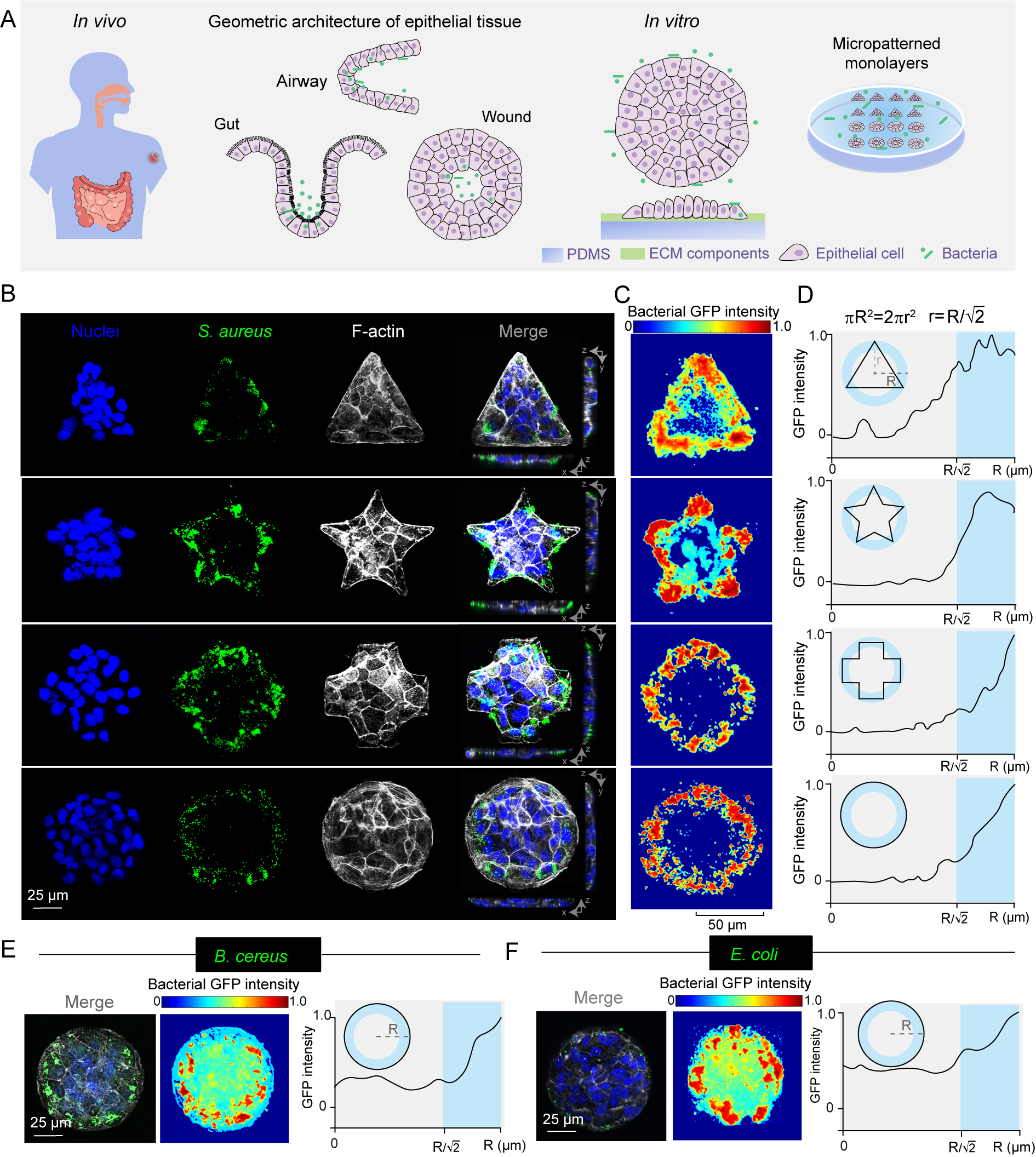 上皮细胞层是人体抵御外界感染的第一道防线,在维持身体正常状态、保护屏障和抵抗感染的过程中,其形状和结构会不断发生变化。研究发现,细菌能够顺利获得识别器官组织的几何特性以破坏细胞层的保护作用并引发感染扩散。虽然理解清楚组织器官几何特性调控细菌感染的具体机制对开发新型抗感染疗法具有关键意义,但这一科学问题尚未得到充分揭示。