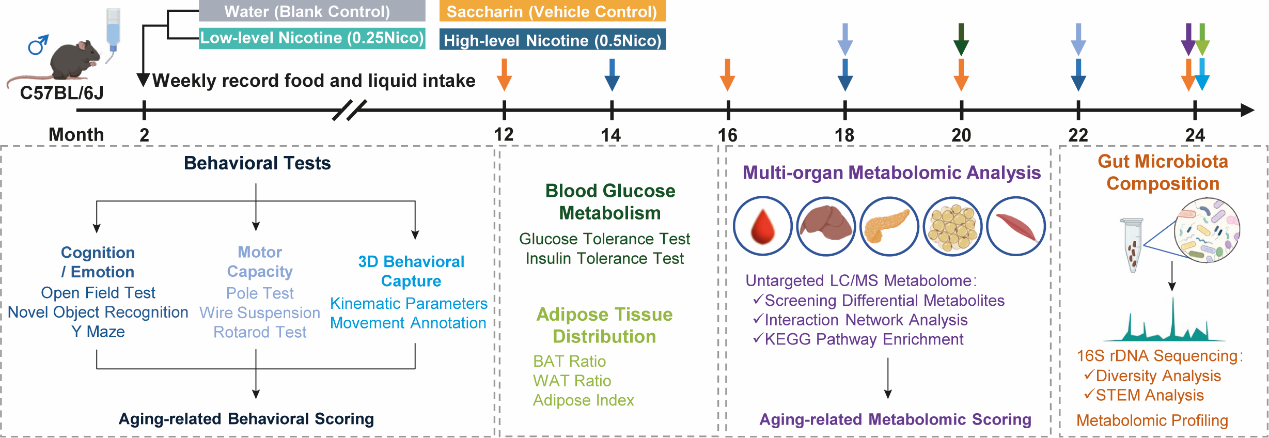 本研究采用长达22个月的实验设计,自小鼠8周龄起分别给予0.25 g/L(低剂量)和0.5 g/L(高剂量)尼古丁溶液,模拟人类长期非吸入式尼古丁暴露情景。研究团队在14、18、22和24月龄四个关键时间点,对小鼠进行了系统性、多维度的行为学评估与多组学检测,包括情绪、认知、运动和精细行为学监测、代谢组学分析以及肠道菌群测序,实现了小鼠长程生命周期生理状态的纵向动态追踪(图1)。