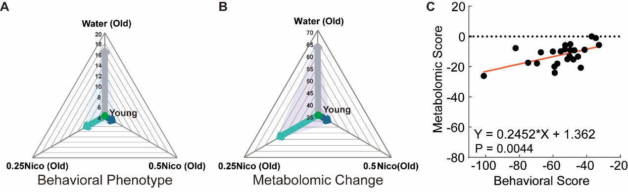 与此同时,研究团队针对复杂的系统性衰老进程,开发了创新性的 “行为-代谢年龄评分系统(BMAge)”,整合了行为学表现与多器官关键代谢物指标,从而能够更精准地量化衰老进程的动态变化。研究显示,长期饮用尼古丁的小鼠代谢评分呈现出特定的变化模式,为系统性衰老评估及干预研究给予了新的科学工具(图3)。