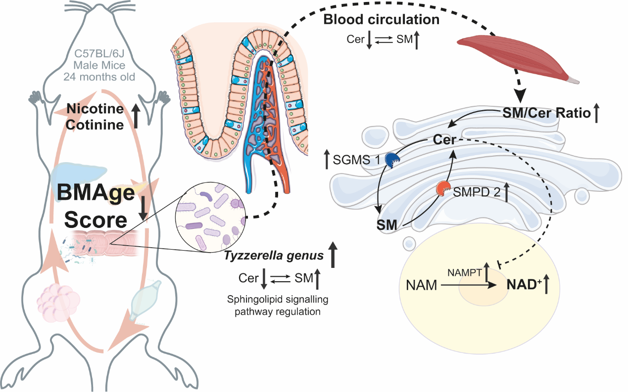 研究发现,长期饮用尼古丁并不显著影响小鼠的学习记忆或血糖代谢,也未观察到对肝脏、胰腺等器官的结构性损伤或免疫抑制。值得关注的是,尼古丁在衰老过程中表现出显著的运动功能保护作用,高剂量组尤为明显,提示其可能具备抗“运动虚弱”的潜在价值。代谢组学分析显示,尼古丁可重塑多个器官的能量与脂类代谢通路,其中白色脂肪组织可能发挥关键调控作用。肠道菌群研究发现,尼古丁可维持Tyzzerella等菌属的稳定丰度。进一步的关联网络分析提示,鞘脂代谢通路的激活可能介导了“肠-—代谢--运动”调控轴,肠道菌群代谢物富集于鞘脂信号通路,提示尼古丁重塑衰老代谢或顺利获得鞘脂代谢实现。分子信号通路研究进一步表明,尼古丁顺利获得影响鞘磷脂(SM)与神经酰胺(Cer)间的平衡、减少Cer相对积累来重塑能量代谢;鞘磷脂合成酶和中性水解酶参与调控该鞘磷脂-—神经酰胺稳态,最终可能介导尼古丁在衰老过程中对运动功能下降的保护作用(图4)。