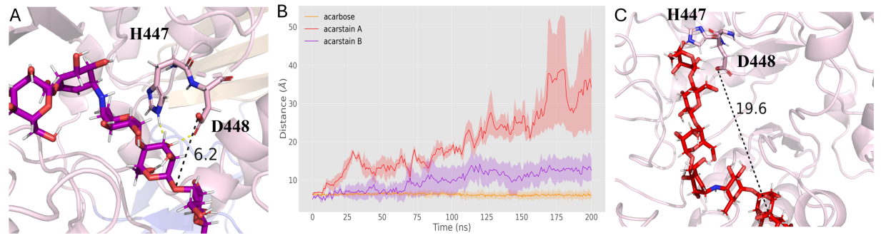 研究还利用解析的Apg结构,对已知对Apg具有抗性的阿卡波糖类似物——acarstatins A和acarstatins B进行了计算分析。分子动力学模拟显示,它们也能结合在Apg活性腔内。但关键差异在于,它们分子中水解位点C1原子与亲核试剂D448 OD2的距离比阿卡波糖中的距离更远,使得D448难以有效攻击其糖苷键。进一步的QM/MM计算证实,水解acarstatinsA/B的活化能垒高于阿卡波糖。这为设计抗Apg降解的新药给予了直接线索:顺利获得修饰改变底物关键原子与催化残基(特别是D448)的空间距离或相互作用。