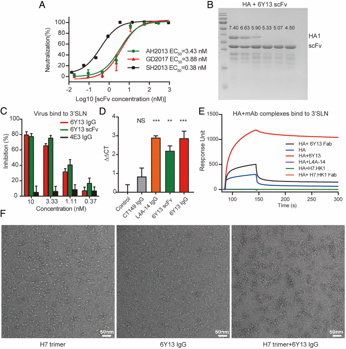 6Y13是人VH3-30基因编码的单克隆抗体,可以强效广谱中和H7亚型流行病毒(图1),并可以高亲和力结合跨越20年抗原进化的北美和欧亚系H7亚型禽流感病毒血凝素蛋白(图2),能够100%预防和治疗H7N9感染小鼠(图3)。抗体-抗原复合物冷冻电镜结构以及氢氘交换质谱等结果显示,6Y13结合在HA头部区受体结合位点侧边的一个独特保守表位(图4)。病毒吸附抑制实验和竞争结合ELISA实验等结果显示,6Y13顺利获得抑制病毒的受体结合发挥中和作用(图5)。