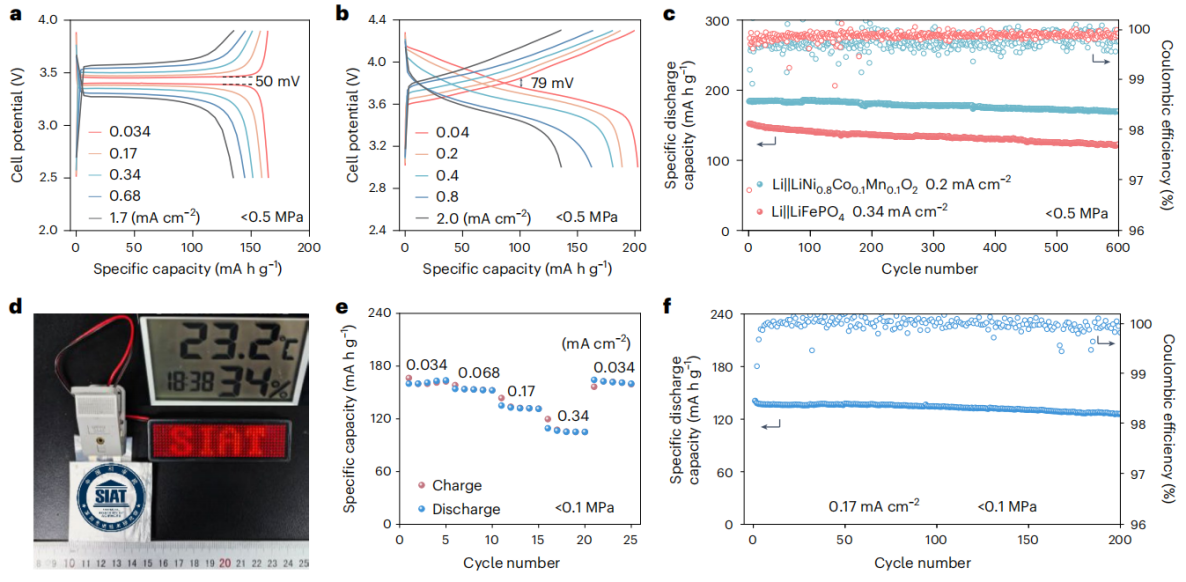 已报道的高离子电导的无机固态电解质普遍存在固-固界面接触差的问题,导致这些材料必须依赖外部施加的高堆叠压力(通常为数MPa至数百MPa不等)来维持电化学循环所必需的界面接触。而PA-LiMPS/PEO电解质实现了全固态锂电池在无外加堆叠压力条件下的稳定工作,与传统高性能无机固态电解质形成了鲜明对比。摆脱了夹具束缚,有利于大幅提升能量密度和简化工艺与成本,与传统高性能无机固态电解质形成了鲜明对比。