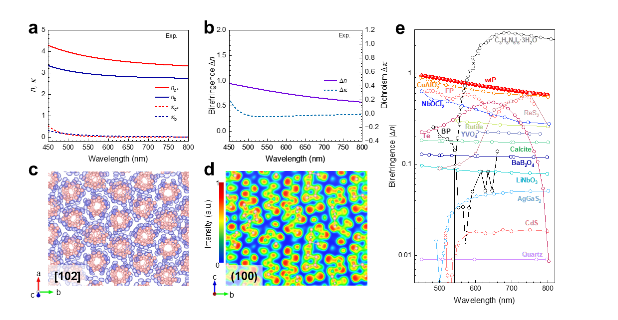 图2 性能数据图显示,wtP(红色数据点)的双折射值在可见光区远超氟化镁、方解石、二氧化钛等传统材料,以及氮化硼、黑磷等二维材料。
