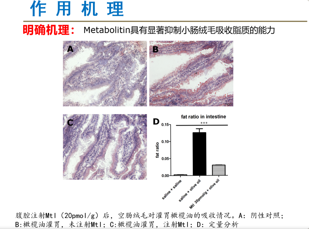 任培根说,在人体肠道中有一层肠绒毛,负责食物的吸收。由于演化过程中机体对能量的渴望,这层绒毛往往对营养物质和脂质“照单全收”。“简言之,我们的药物顺利获得抑制一种叫做Neurotensin的脑肠肽,可以关闭小肠绒毛上吸收脂质的通道,对其他营养吸收通道则似乎并无影响,现在可以减少70%左右的脂质吸收。而未被吸收的脂质可以顺着消化道排出,这就是‘节源’。”实验设计中,小鼠摄入橄榄油并服用多肽药物,对比显示,用药后的小鼠小肠绒毛吸收脂质能力降低数倍,肝脏脂肪量也显著降低。他告诉记者,这类药物所带来的肝脏等组织器官中的脂质燃烧、降低血糖等作用,可以促进已经在组织、细胞中的脂质离开,从而做到“开流”。